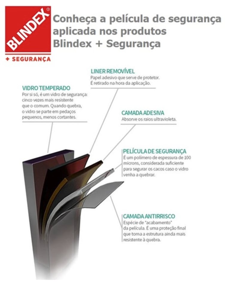O vidro Blindex + Segurança possui uma exclusiva película de segurança que, além de aumentar a resistência do vidro temperado, mantém os fragmentos de vidro unidos e seguros em caso de quebra.